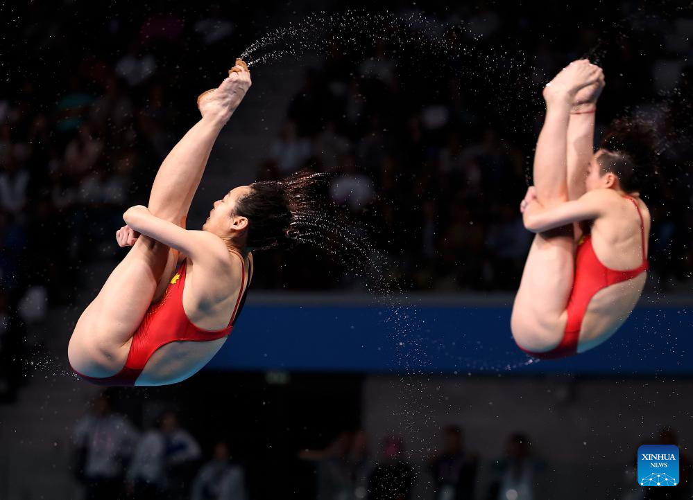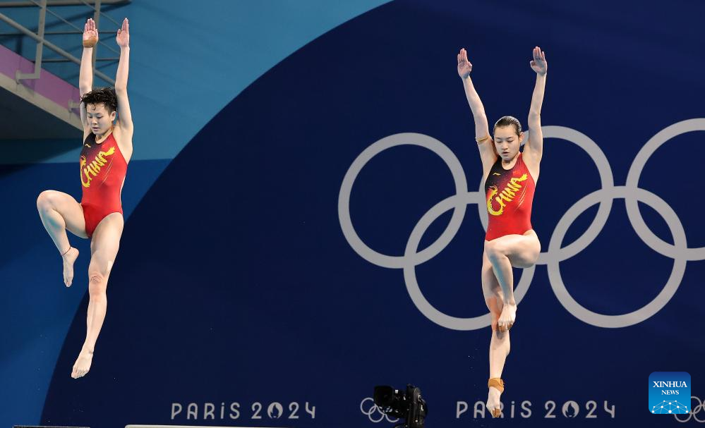 Chang Yani (R)/Chen Yiwen of China compete during the women's synchronised 3m springboard final of diving at the Paris 2024 Olympic Games in Saint Denis, near Paris, France, on July 27, 2024. (Xinhua/Li Ying)