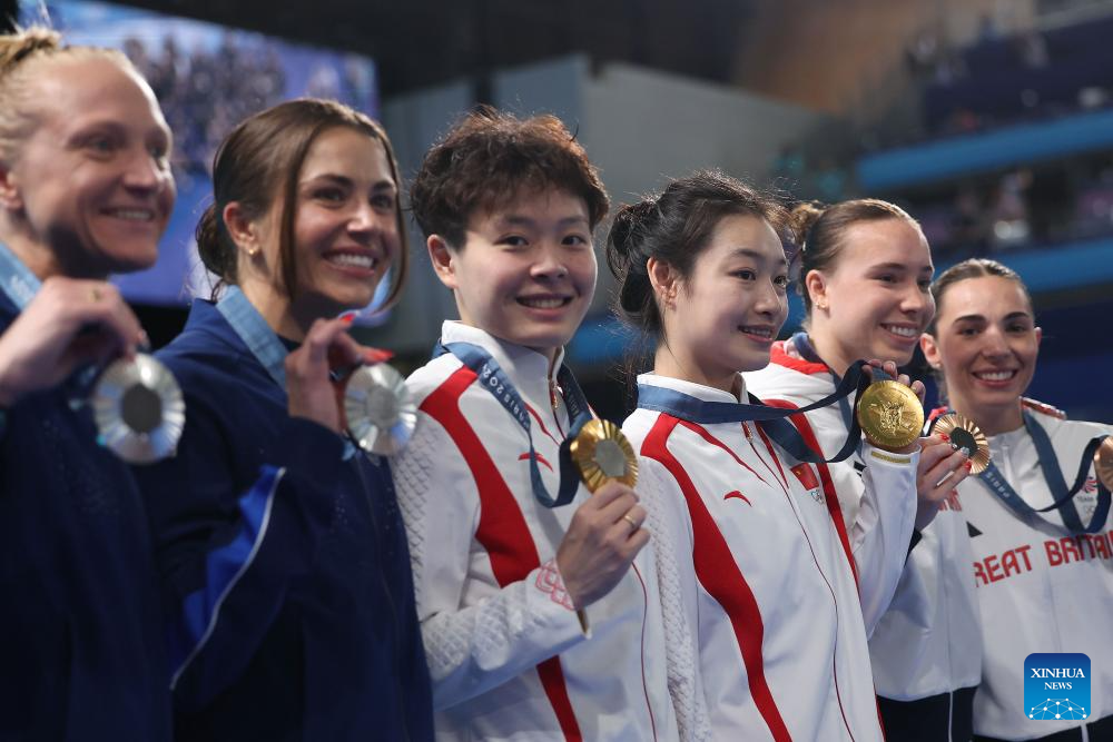 Silver medallists Sarah Bacon/Kassidy Cook of the United States, gold medalists Chang Yani/Chen Yiwen of China and bronze medallists Yasmin Harper/Scarlett Mew Jensen of Britain pose for photos during the awarding ceremony after the women's synchronised 3m springboard final of diving at the Paris 2024 Olympic Games in Saint Denis, near Paris, France, on July 27, 2024. (Xinhua/Li Ying)
