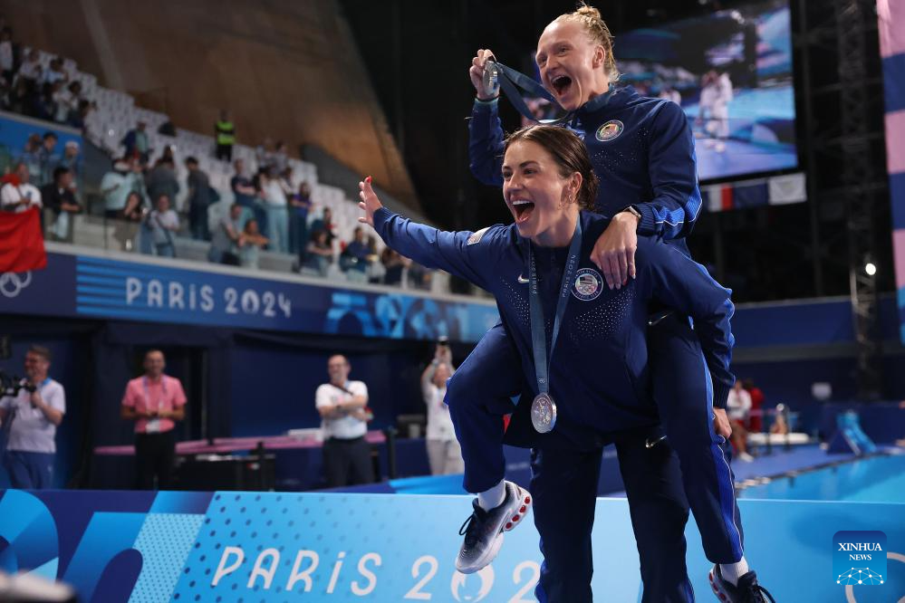 Silver medalists Sarah Bacon (upper)/Kassidy Cook of the United States celebrate during the awarding ceremony after the women's synchronised 3m springboard final of diving at the Paris 2024 Olympic Games in Saint Denis, near Paris, France, on July 27, 2024. (Xinhua/Zhang Yuwei)