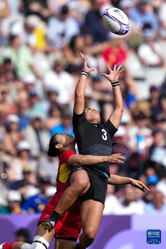 Stacey Waaka (top) of New Zealand vies against Zhou Yan of China during the rugby sevens women's pool A match between China and New Zealand at the Paris 2024 Olympic Games in Paris, France, on July 28, 2024. (Xinhua/Xu Chang)