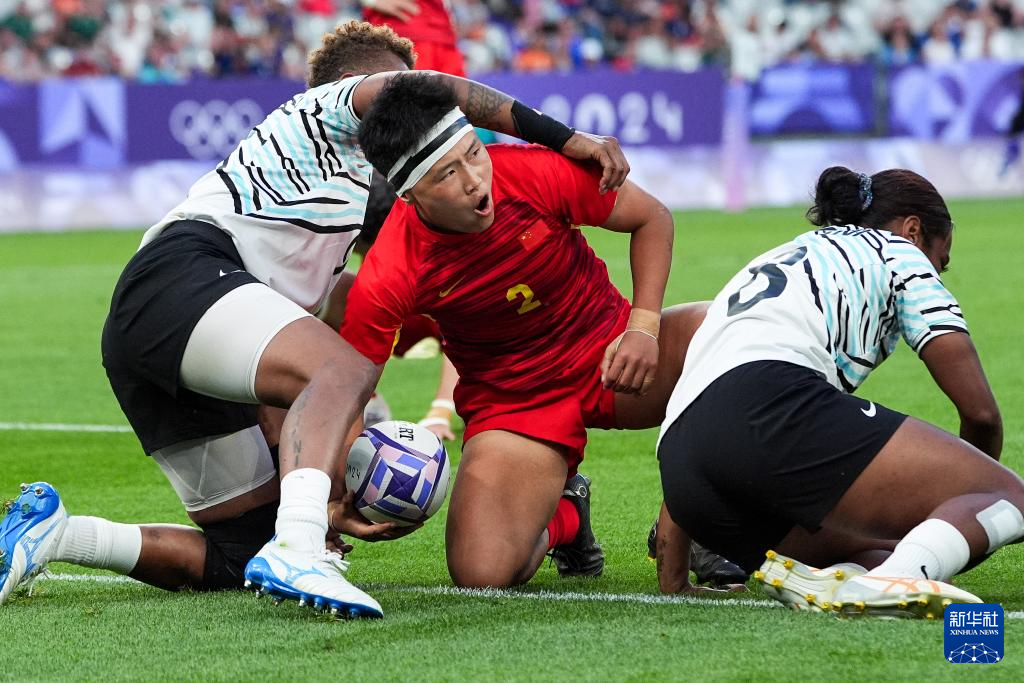 Yang Feifei (1st R) of China grapples the ball during the rugby sevens women's pool A match between China and Fiji at Paris 2024 Olympic Games in Paris, France, July 28, 2024. (Xinhua/Xu Chang)