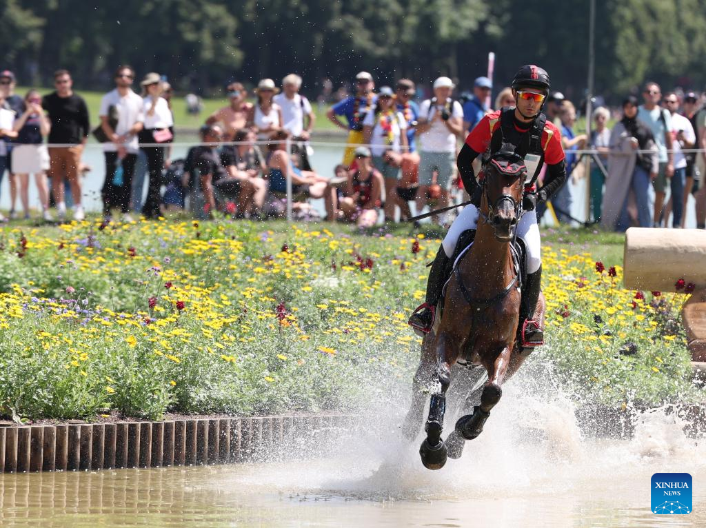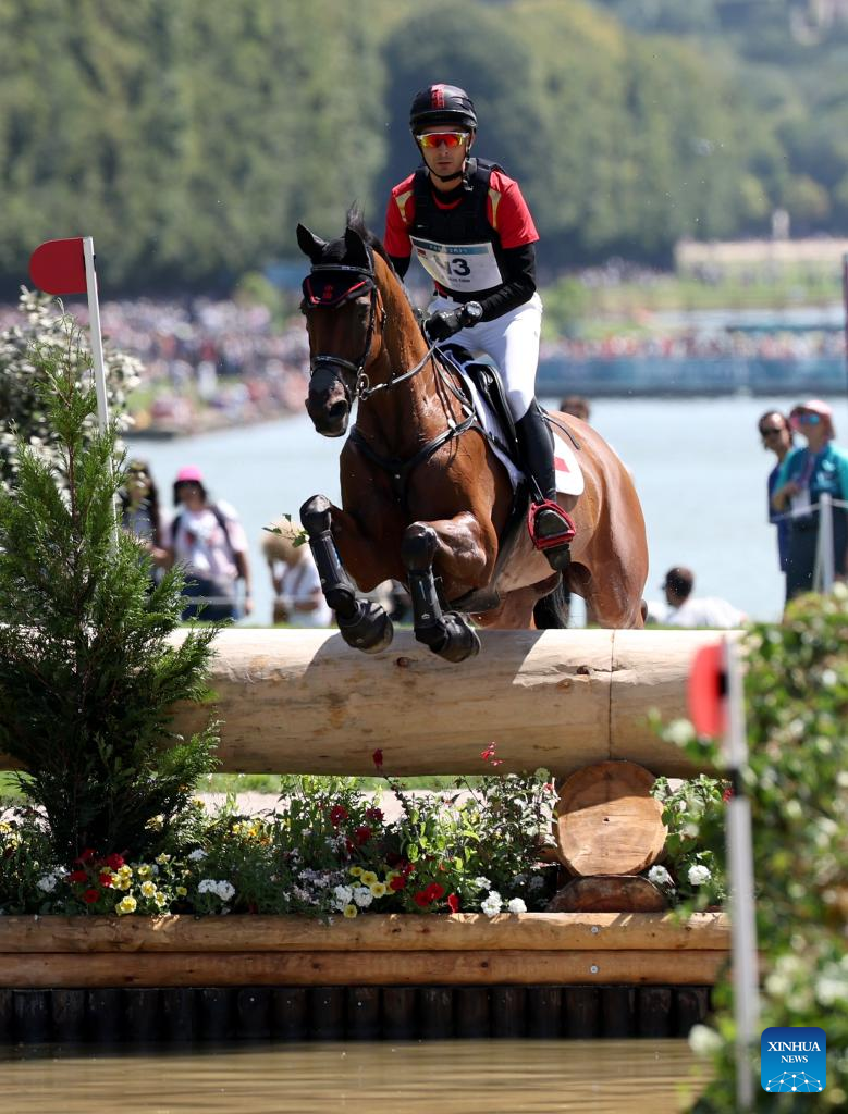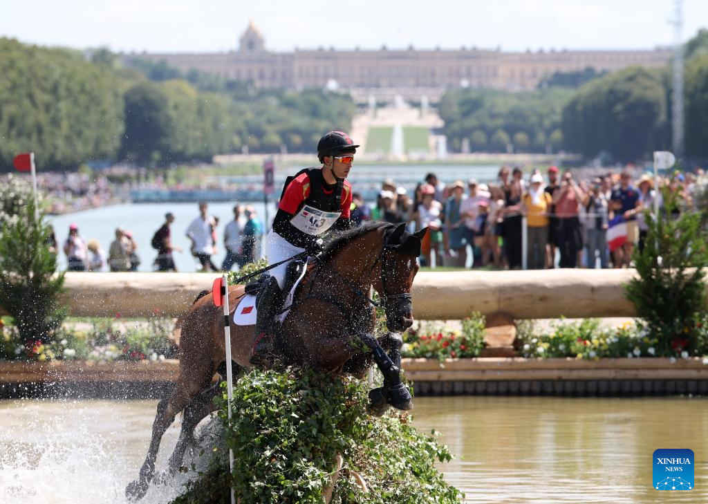 Alex Hua Tian of China competes during the cross-country phase of the equestrian eventing individual competition at the Paris 2024 Olympic Games in Versailles, France, July 28, 2024. (Xinhua/Li Ying)