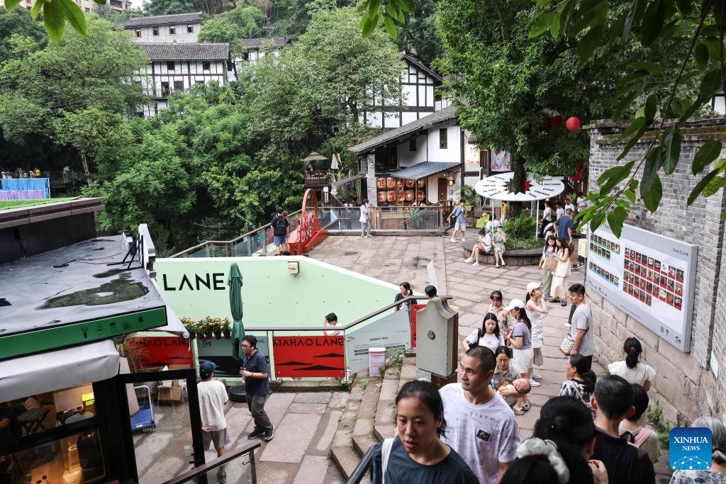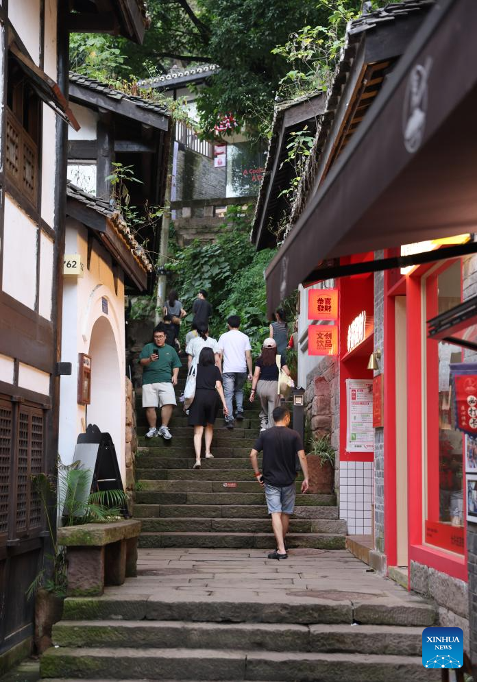 Tourists visit Longmenhao old street in Nan'an District in southwest China's Chongqing Municipality, July 28, 2024. Longmenhao old street, featuring more than 200 ancient architectures built in different forms and periods, was listed in the first batch of urban renewal pilot projects launched by Chongqing. In recent years, local authorities have been integrating natural, cultural, artistic, digital and other elements into the renovation of the street, and readjusting the layout according to its historical and cultural characteristics. The creative renovation and upgrading have incentivized young entrepreneurs, injected new vigor into the street and attracted more visitors. (Xinhua/Huang Wei)