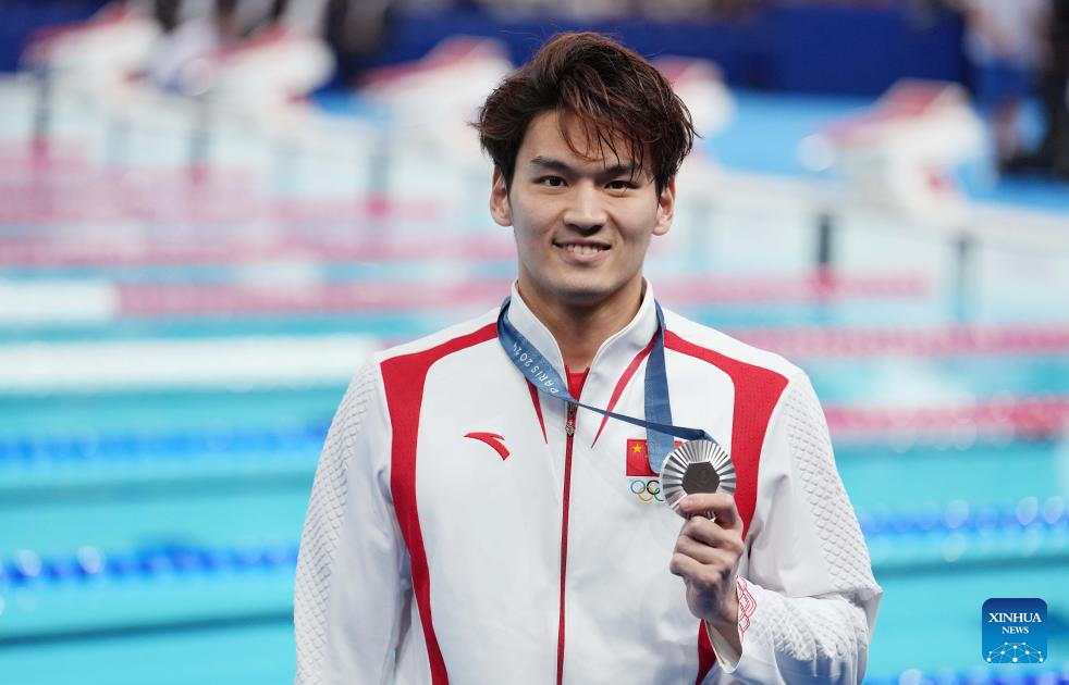 Silver medalist Xu Jiayu of China shows his medal after the victory ceremony for the men's 100m backstroke of swimming at the Paris 2024 Olympic Games in Paris, France, July 29, 2024. (Xinhua/Xue Yuge)