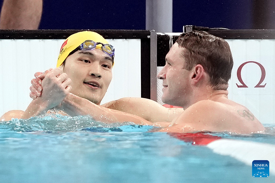 Xu Jiayu (L) of China shakes hands with Ryan Murphy of the United States after the men's 100m backstroke final of swimming at the Paris 2024 Olympic Games in Paris, France, July 29, 2024. (Xinhua/Wang Yuguo)