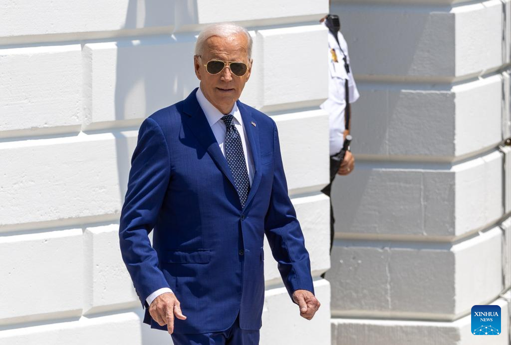 U.S. President Joe Biden walks toward the South Lawn to board Marine One at the White House in Washington, D.C., the United States, on July 29, 2024. (Xinhua/Hu Yousong)