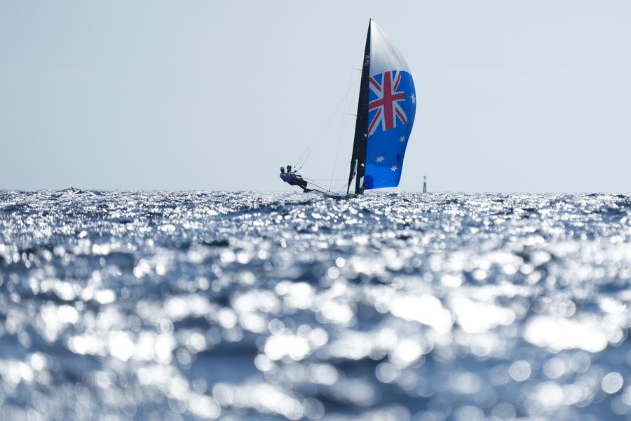 Jim Colley/Shaun Connor of Australia compete during the Men's Skiff 49er Sailing events of the Paris 2024 Olympic Games at the Marseille Marina in Marseille, France, July 30, 2024. (Xinhua/Zheng Huansong)