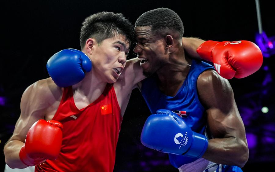 Tuohetaerbieke Tanglatihan (L) of China competes against Cristian Javier Pinales of Dominican Republic during the men's 80kg preliminaries round of 16 of boxing at the Paris 2024 Olympic Games in Paris, France, July 30, 2024. (Xinhua/Jiang Wenyao)