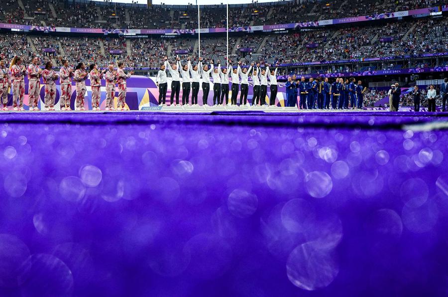Gold medalists team New Zealand (C), silver medalists team Canada (L) and bronze medalists team USA attend during the victory ceremony of the women's rugby sevens at Paris 2024 Olympic Games in Paris, France, July 30, 2024. (Xinhua/Xu Chang)