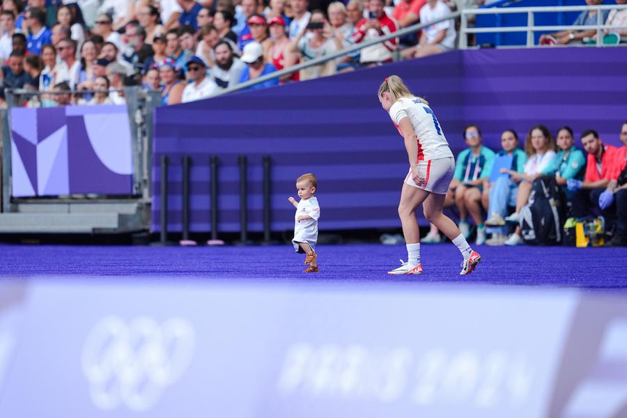 Chloe Jacquet of team France is pictured with her baby after the women's rugby sevens placing match 5-6 between team China and team France at the Paris 2024 Olympic Games in Paris, France, July 30, 2024. (Xinhua/Xu Chang)