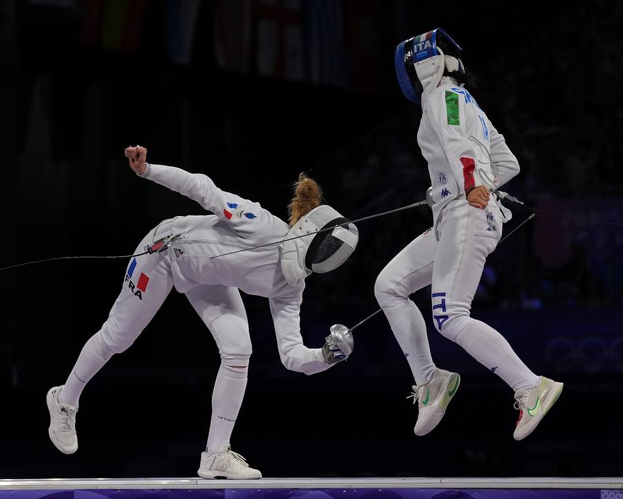 Alberta Santuccio (R) of Italy competes during the women's epee team gold medal match of fencing between France and Italy at the Paris 2024 Olympic Games in Paris, France, on July 30, 2024. (Xinhua/Fei Maohua)