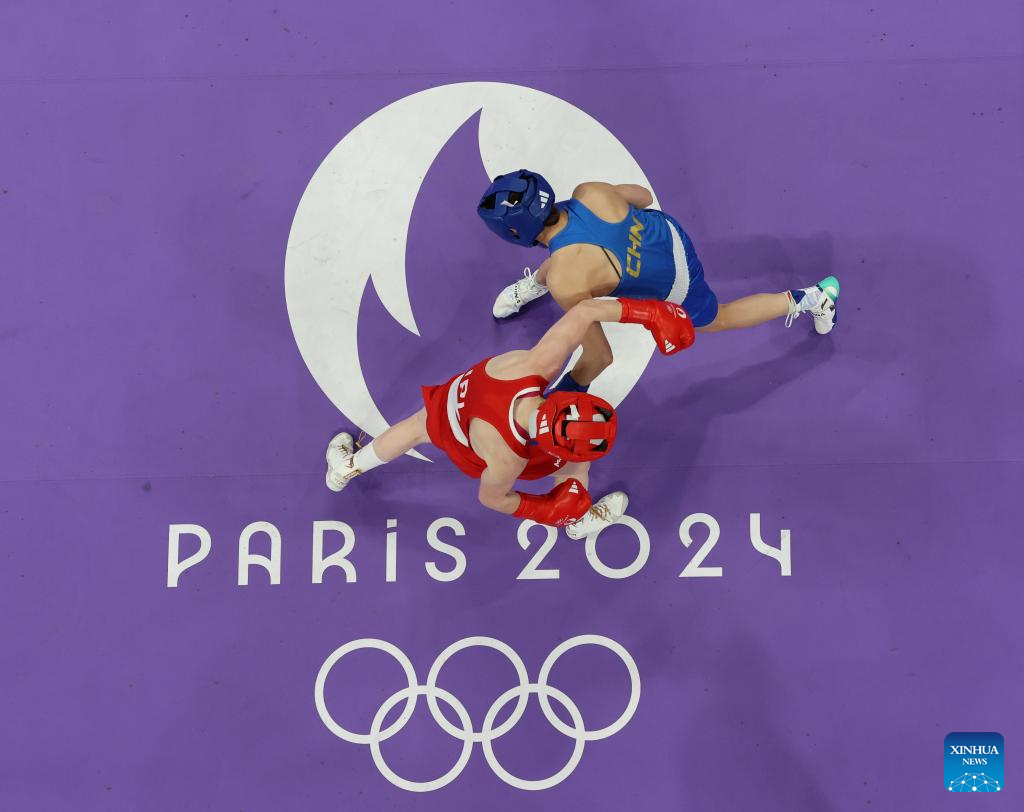 Chang Yuan (R) of China competes against Jennifer Lehane of Ireland during the women's 54kg preliminaries round of 16 of boxing at the Paris 2024 Olympic Games in Paris, France, July 30, 2024. (Xinhua/Guo Yu)
