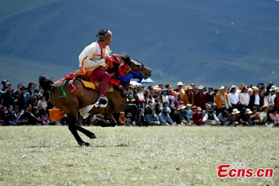 A rider demonstrates his skills at a horse racing event in Litang County, the Tibetan Autonomous Prefecture of Garze, southwest China's Sichuan Province, July 30, 2024. (Photo: China News Service/Liu Zhongjun)