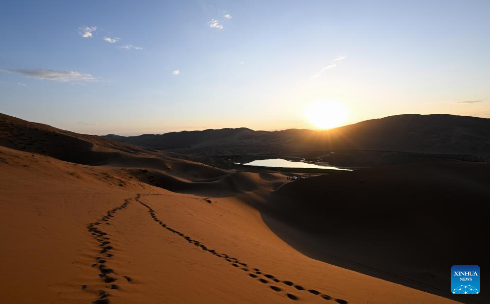 This photo taken on July 30, 2024 shows a view of the Badain Jaran Desert at sunset in north China's Inner Mongolia Autonomous Region. Located in the hyper-arid region of northwestern China, the Badain Jaran Desert is the country's third largest desert and second largest drifting desert.