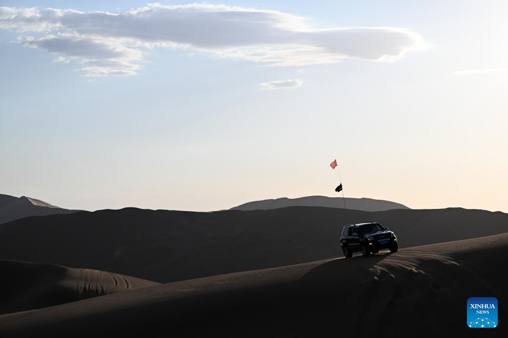 An off-road vehicle runs in the Badain Jaran Desert in north China's Inner Mongolia Autonomous Region, July 30, 2024. Located in the hyper-arid region of northwestern China, the Badain Jaran Desert is the country's third largest desert and second largest drifting desert.