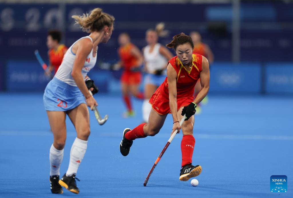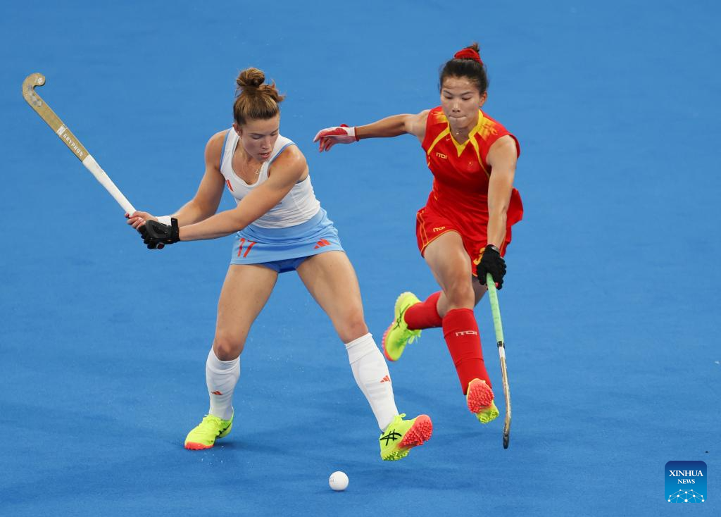 Gu Bingfeng (front) of China competes during the women's pool A match of hockey between the Netherlands and China in Colombes, northwest suburbs of Paris, France, July 31, 2024. (Xinhua/Ren Pengfei)