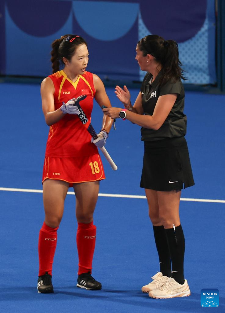 Zou Meirong (L) of China talks with the umpire during the women's pool A match of hockey between the Netherlands and China in Colombes, northwest suburbs of Paris, France, July 31, 2024. (Xinhua/Ren Pengfei)
