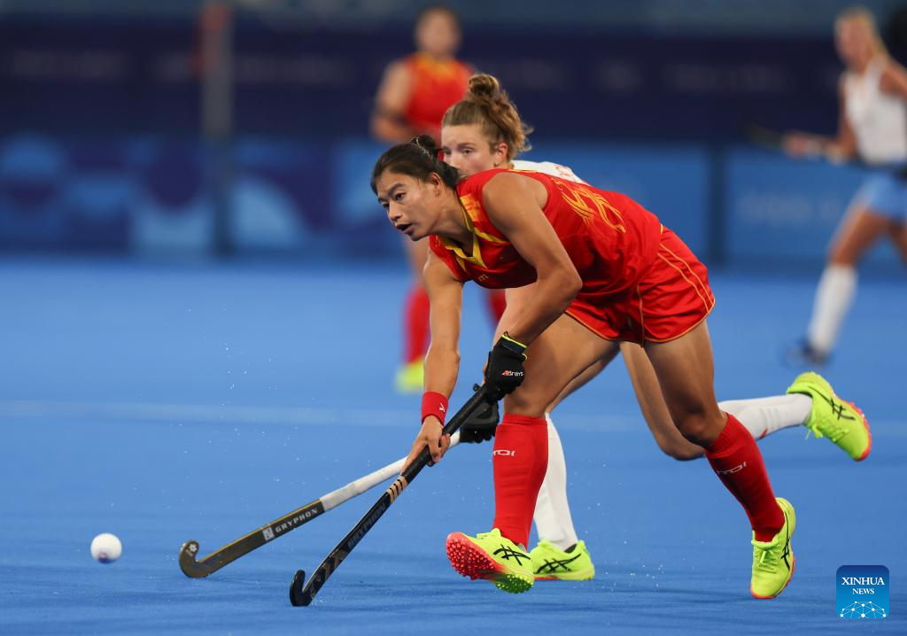 Ma Ning (front) of China competes during the women's pool A match of hockey between the Netherlands and China in Colombes, northwest suburbs of Paris, France, July 31, 2024. (Xinhua/Ren Pengfei)