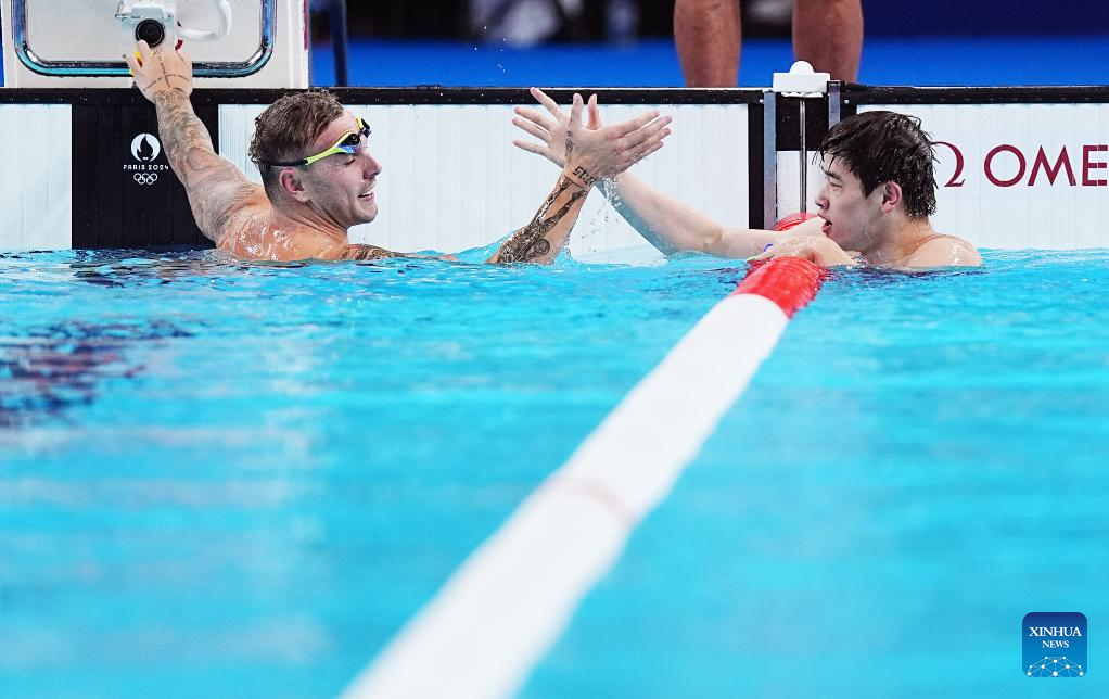 Pan Zhanle (R) of China shakes hands with Kyle Chalmers of Australia after the men's 100m freestyle final of swimming at Paris 2024 Olympic Games in Paris, France, on July 31, 2024. (Xinhua/Du Yu)