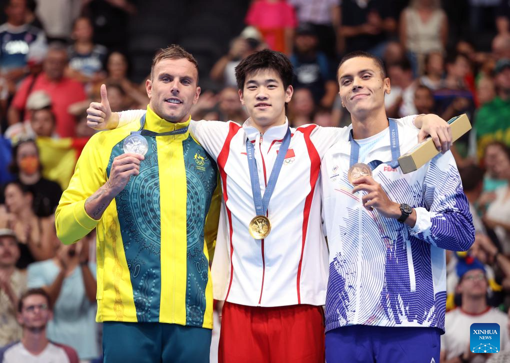 Gold medalist Pan Zhanle (C) of China, silver medalist Kyle Chalmers (L) of Australia and bronze medalist David Popovici of Romania pose during the victory ceremony for the men's 100m freestyle of swimming at Paris 2024 Olympic Games in Paris, France, on July 31, 2024. (Xinhua/Luo Yuan)