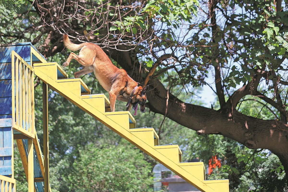 A police dog undertakes an obstacle course. (WANG ZHUANGFEI/CHINA DAILY)