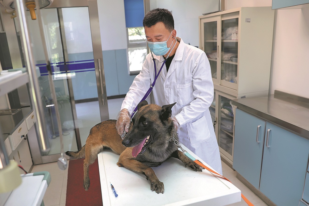 A veterinarian conducts routine checkups on a Belgian Malinois. (WANG ZHUANGFEI/CHINA DAILY)