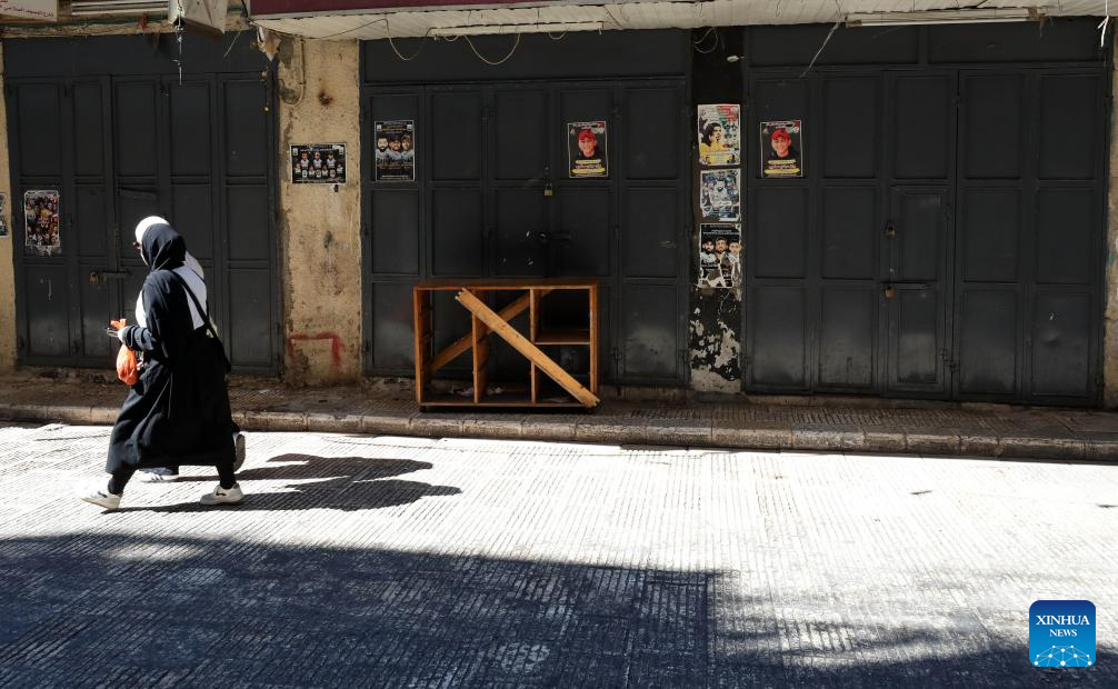 People walk past closed shops during a general strike in the West Bank city of Nablus, on July 31, 2024. The Palestinian National and Islamic Forces on Wednesday declared a general strike across Palestine, condemning the assassination of Hamas Politburo Chief Ismail Haniyeh. (Photo by Ayman Nobani/Xinhua)