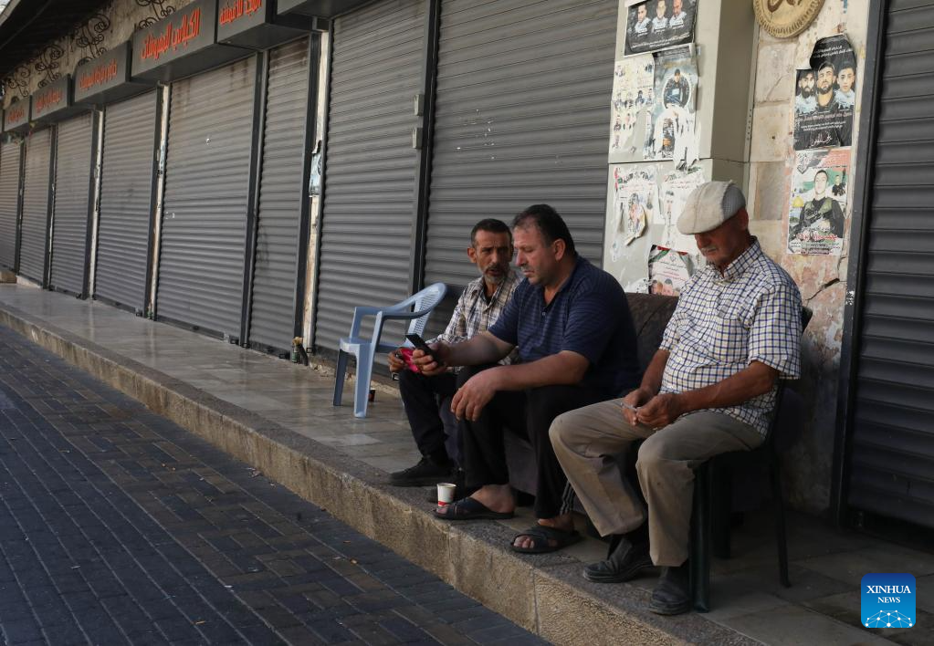 People sit in front of closed shops during a general strike in the West Bank city of Nablus, on July 31, 2024. The Palestinian National and Islamic Forces on Wednesday declared a general strike across Palestine, condemning the assassination of Hamas Politburo Chief Ismail Haniyeh. (Photo by Ayman Nobani/Xinhua)