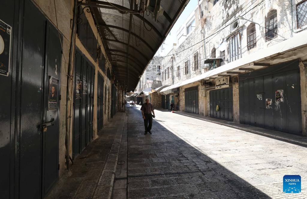 A man walks past closed shops during a general strike in the West Bank city of Nablus, on July 31, 2024. The Palestinian National and Islamic Forces on Wednesday declared a general strike across Palestine, condemning the assassination of Hamas Politburo Chief Ismail Haniyeh. (Photo by Ayman Nobani/Xinhua)