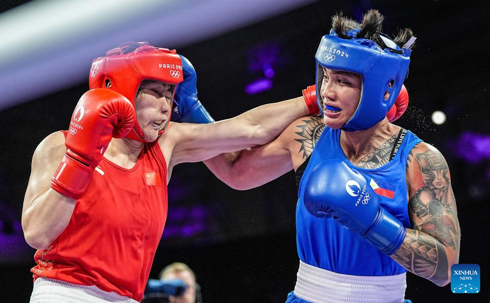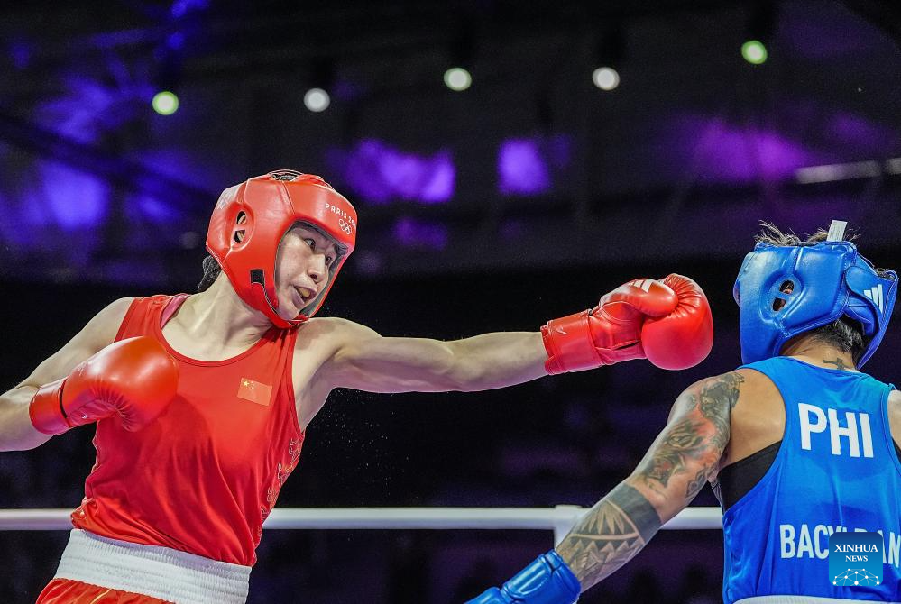 Li Qian (R) of China competes against Hergie Bacyadan of the Philippines during the women's 75kg preliminary round of 16 of boxing at the Paris 2024 Olympic Games in Paris, France, July 31, 2024. (Xinhua/Jiang Wenyao)