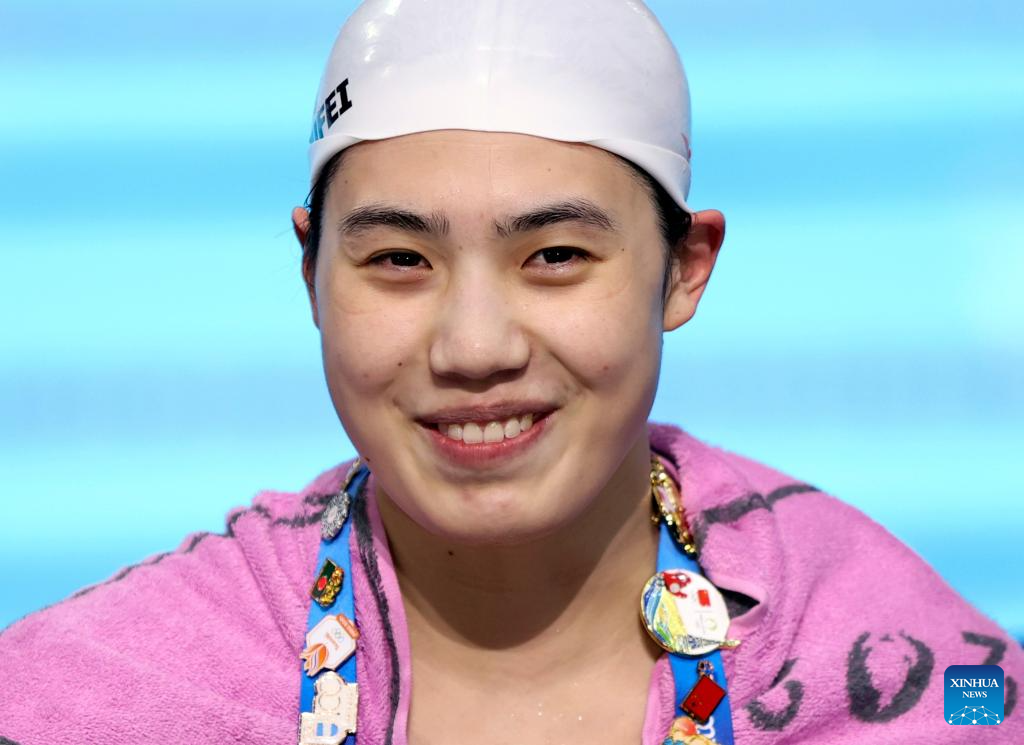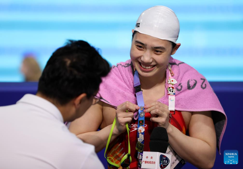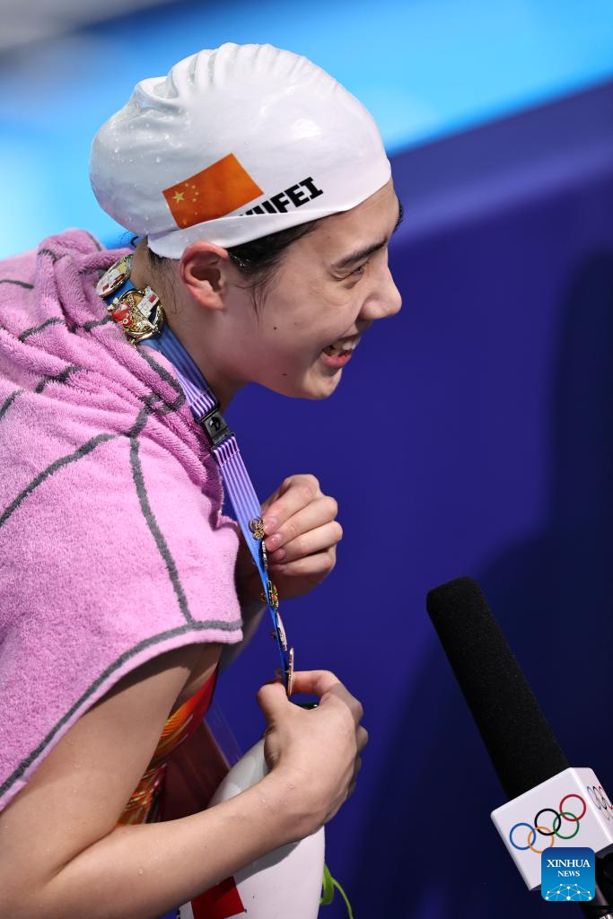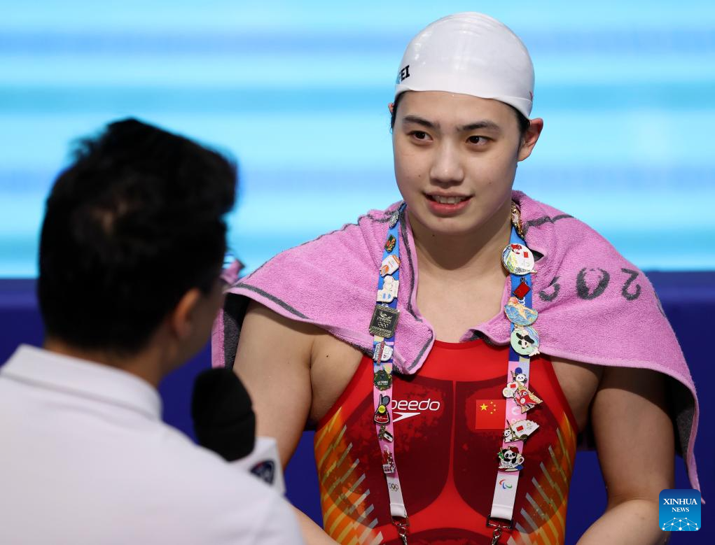 Zhang Yufei of China receives interview after the Women's 200m Butterfly Heat of swimming at the Paris 2024 Olympic Games in Paris, France, on July 31, 2024. (Xinhua/Luo Yuan)