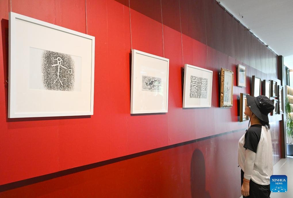 A visitor looks at rock painting rubbings at an art center in Shangye Village of Baita Town in Xianju County, east China's Zhejiang Province, July 28, 2024.