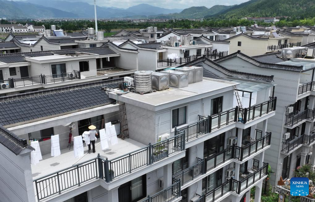 A homestay worker airs bedding in Shangye Village of Baita Town in Xianju County, east China's Zhejiang Province, July 28, 2024.