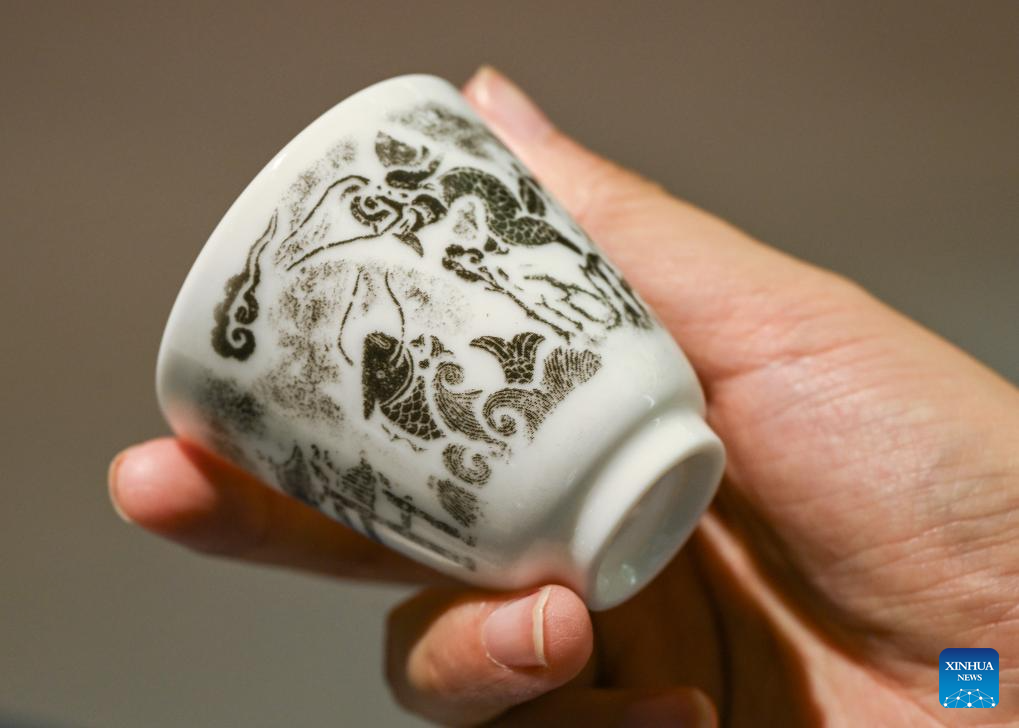 This photo shows a cup developed based on local rock paintings at an art center in Shangye Village of Baita Town in Xianju County, east China's Zhejiang Province, July 28, 2024.