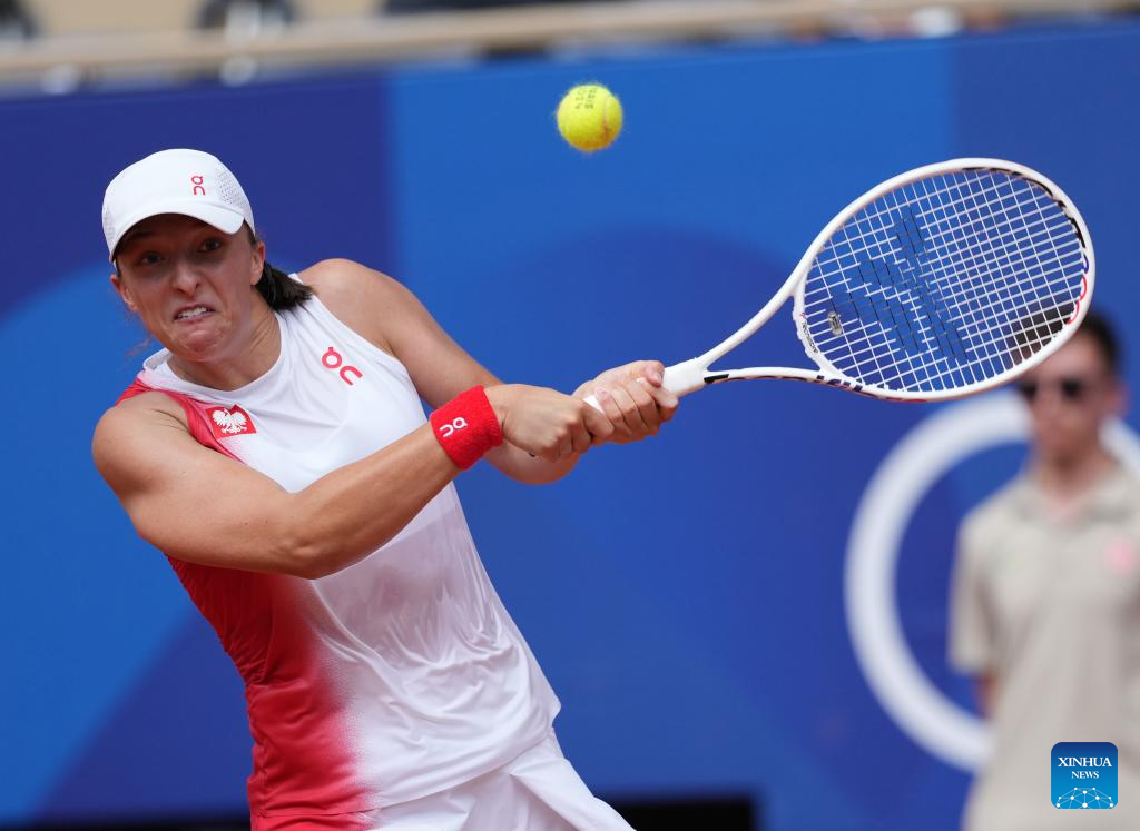 Iga Swiatek of Poland returns the ball during the women's singles semi-final match of tennis between Zheng Qinwen of China and Iga Swiatek of Poland at the Paris 2024 Olympic Games in Paris, France, on Aug. 1, 2024. (Xinhua/Wan Xiang)