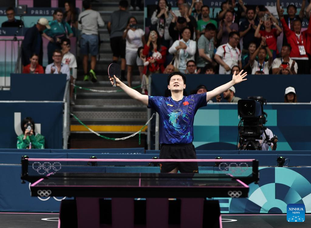 Fan Zhendong of China celebrates after the table tennis men's singles quarterfinal against Harimoto Tomokazu of Japan at Paris 2024 Olympic Games in Paris, France, Aug. 1, 2024. (Xinhua/Wang Dongzhen)
