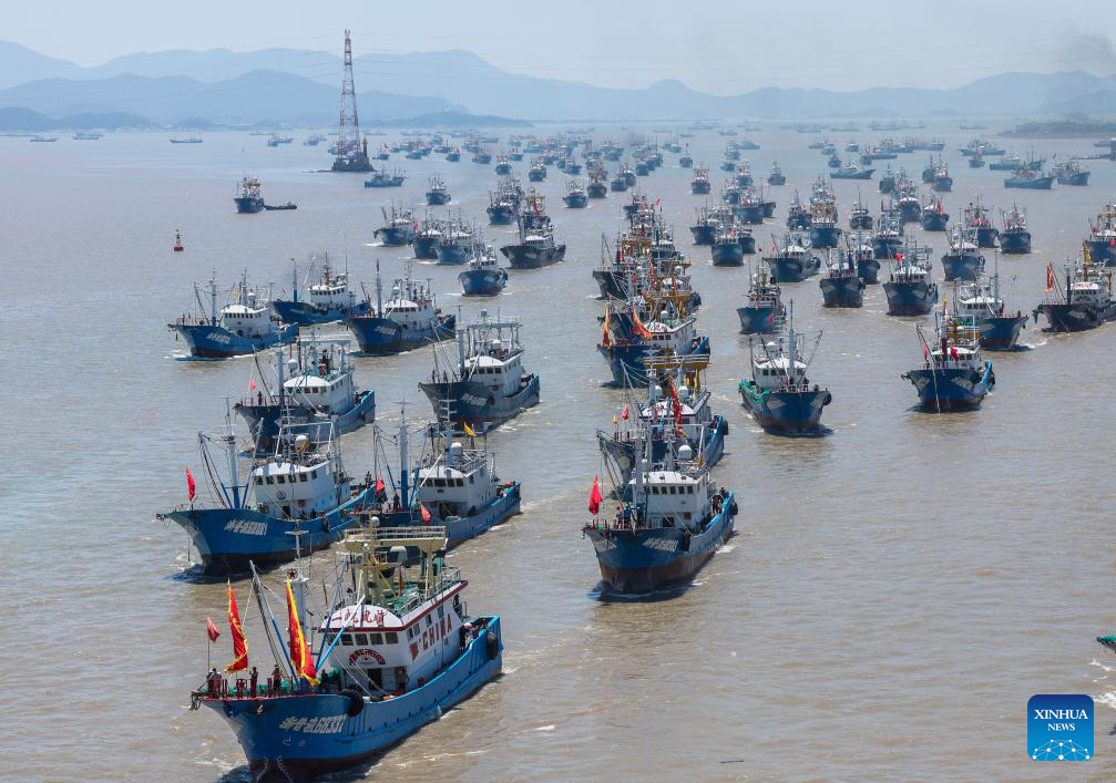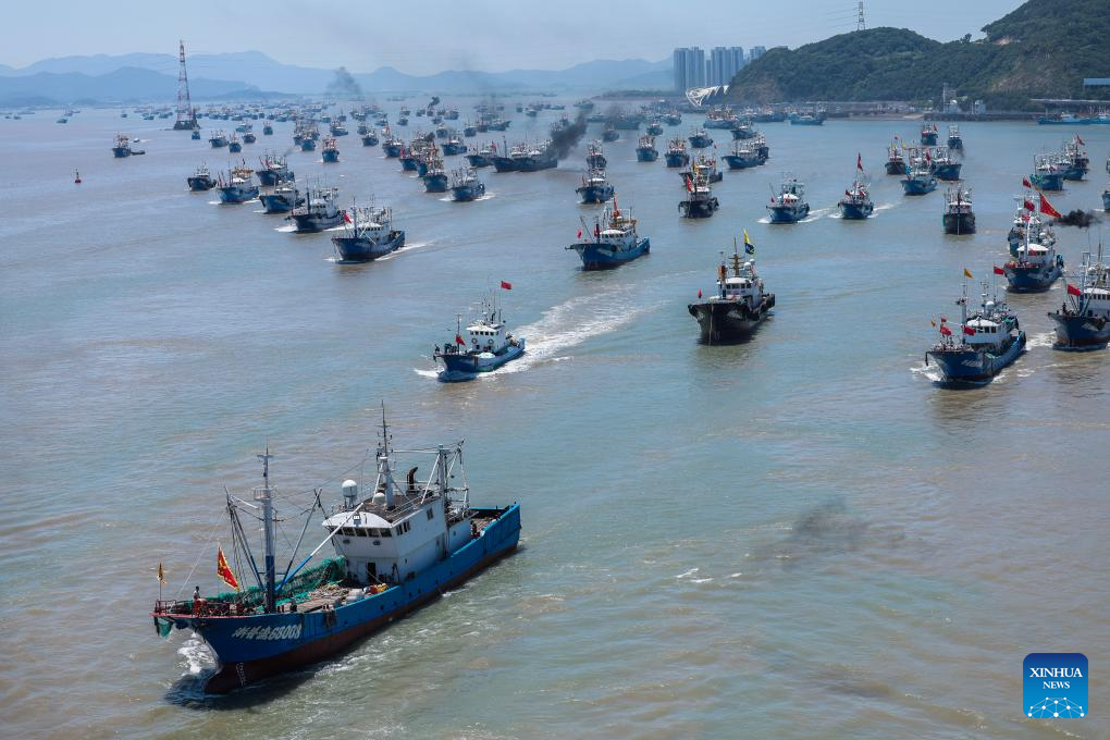 Fishing boats depart for fishing from the Shenjiamen fishing port in Zhoushan City, east China's Zhejiang Province, Aug. 1, 2024. Four types of fishing boats with special permission set sail on Thursday after a three-month summer fishing ban in the East China Sea. (Xinhua/Xu Yu)