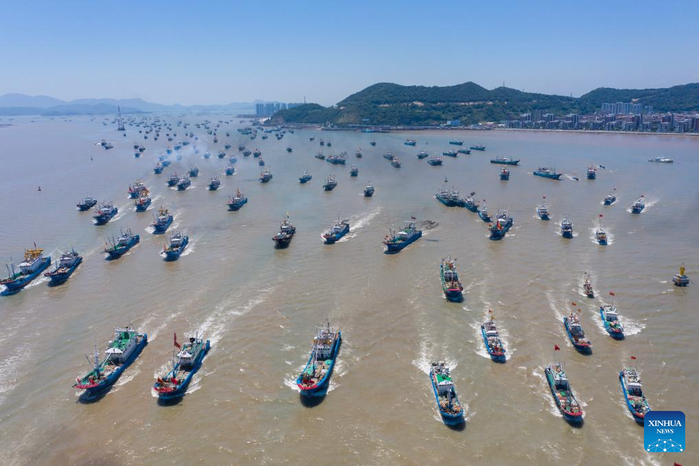 A drone photo taken on Aug. 1, 2024 shows fishing boats departing for fishing from the Shenjiamen fishing port in Zhoushan City, east China's Zhejiang Province. Four types of fishing boats with special permission set sail on Thursday after a three-month summer fishing ban in the East China Sea. (Xinhua/Xu Yu)