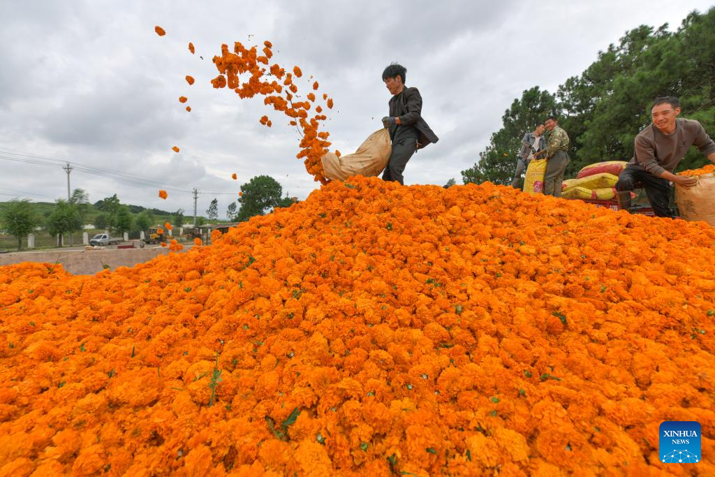 Villagers unload newly picked marigold flowers at Zhengjiaying Village of Weining County, southwest China's Guizhou Province, July 30, 2024. More than 5,000 mu (about 333.3 hectares) of marigolds planted in Weining are in full bloom. Local planting cooperatives have been working with pharmaceutical enterprises to develop marigold planting, and to help farmers increase their income. Marigold is a raw material for herbal medicine. (Xinhua/Yang Wenbin)