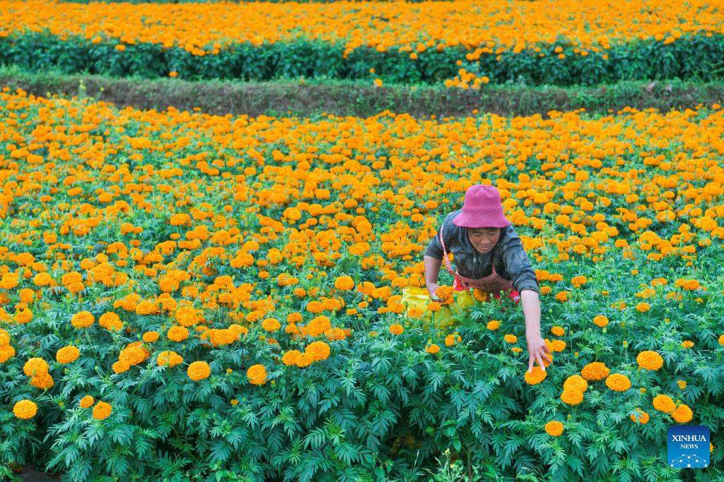 A villager picks marigold flowers at Gaopo Village of Weining County, southwest China's Guizhou Province, July 30, 2024. More than 5,000 mu (about 333.3 hectares) of marigolds planted in Weining are in full bloom. Local planting cooperatives have been working with pharmaceutical enterprises to develop marigold planting, and to help farmers increase their income. Marigold is a raw material for herbal medicine. (Xinhua/Yang Wenbin)