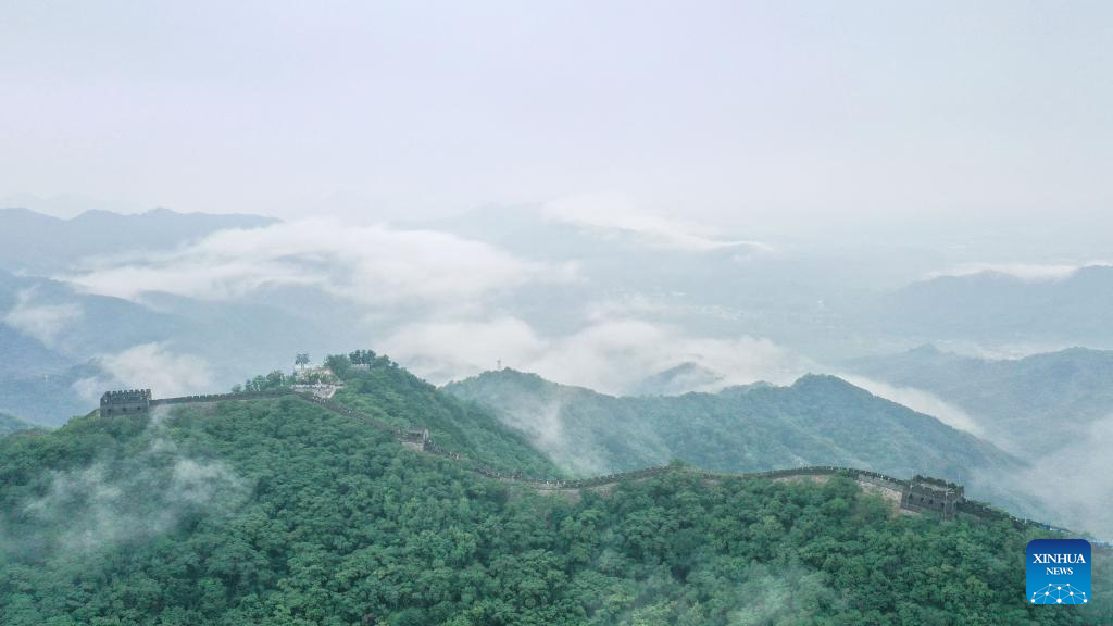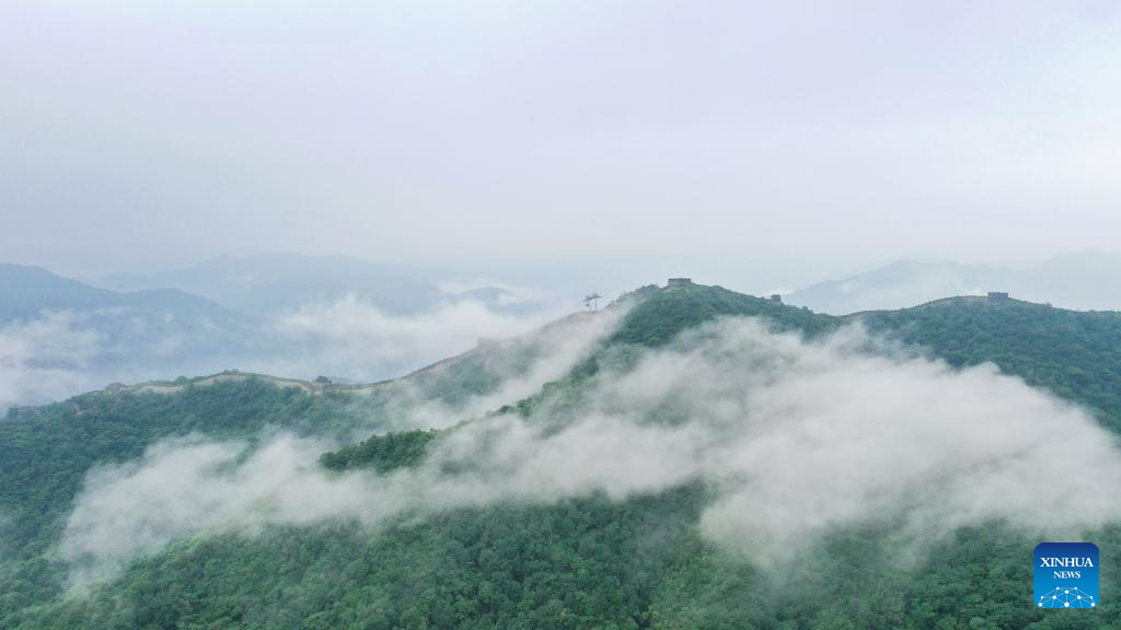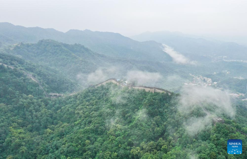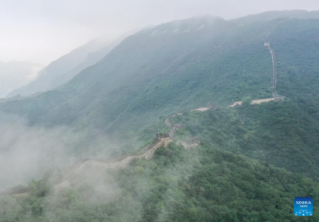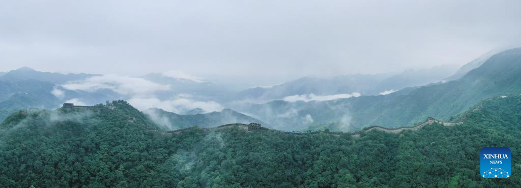 An aerial drone photo taken on Aug. 3, 2024 shows scenery of the Mutianyu section of the Great Wall in Beijing, capital of China. (Xinhua/Chen Yehua)