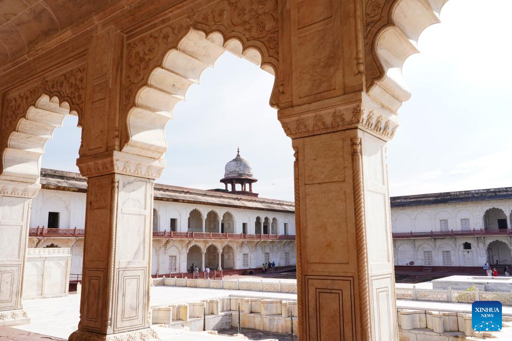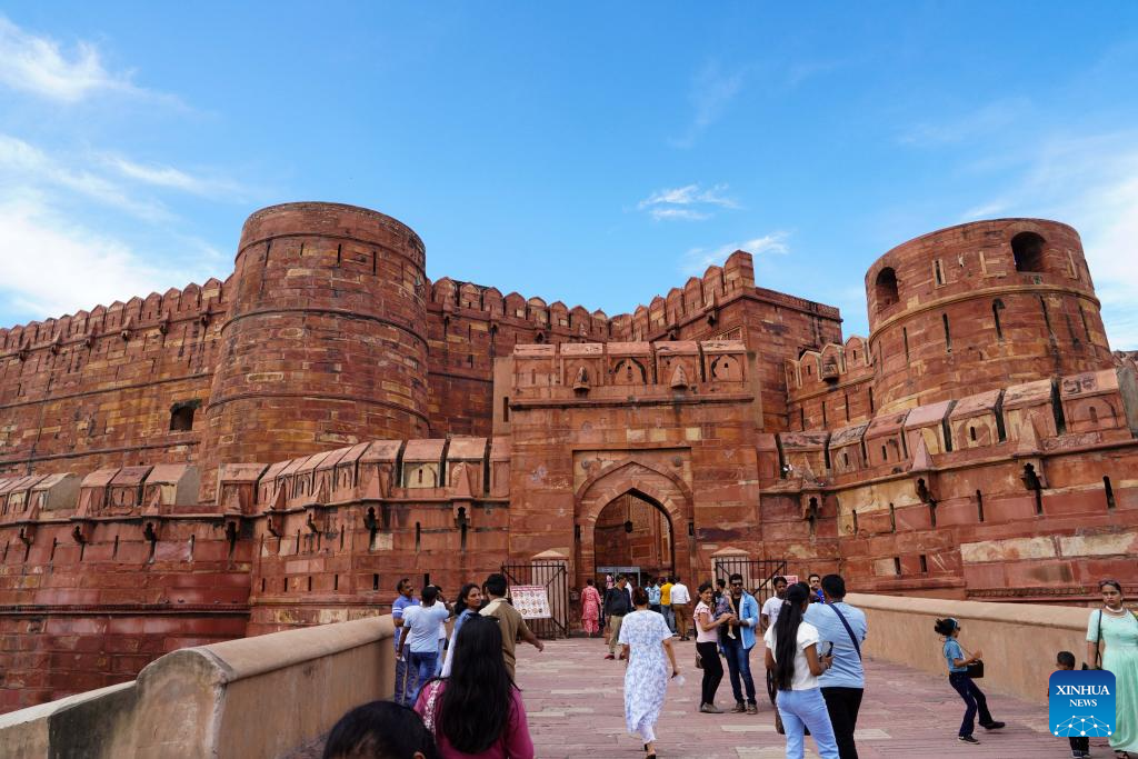 This photo taken on Aug. 3, 2024 shows a view at the Red Fort of Agra in Agra, India. Near the gardens of the Taj Mahal stands the 16th-century Mughal monument known as the Red Fort of Agra. This fortress of red sandstone encompasses, within its 2.5-km-long enclosure walls, the imperial city of the Mughal rulers. It was listed as a World Heritage Site by the UNESCO in 1983. (Xinhua/Chen Dongshu)