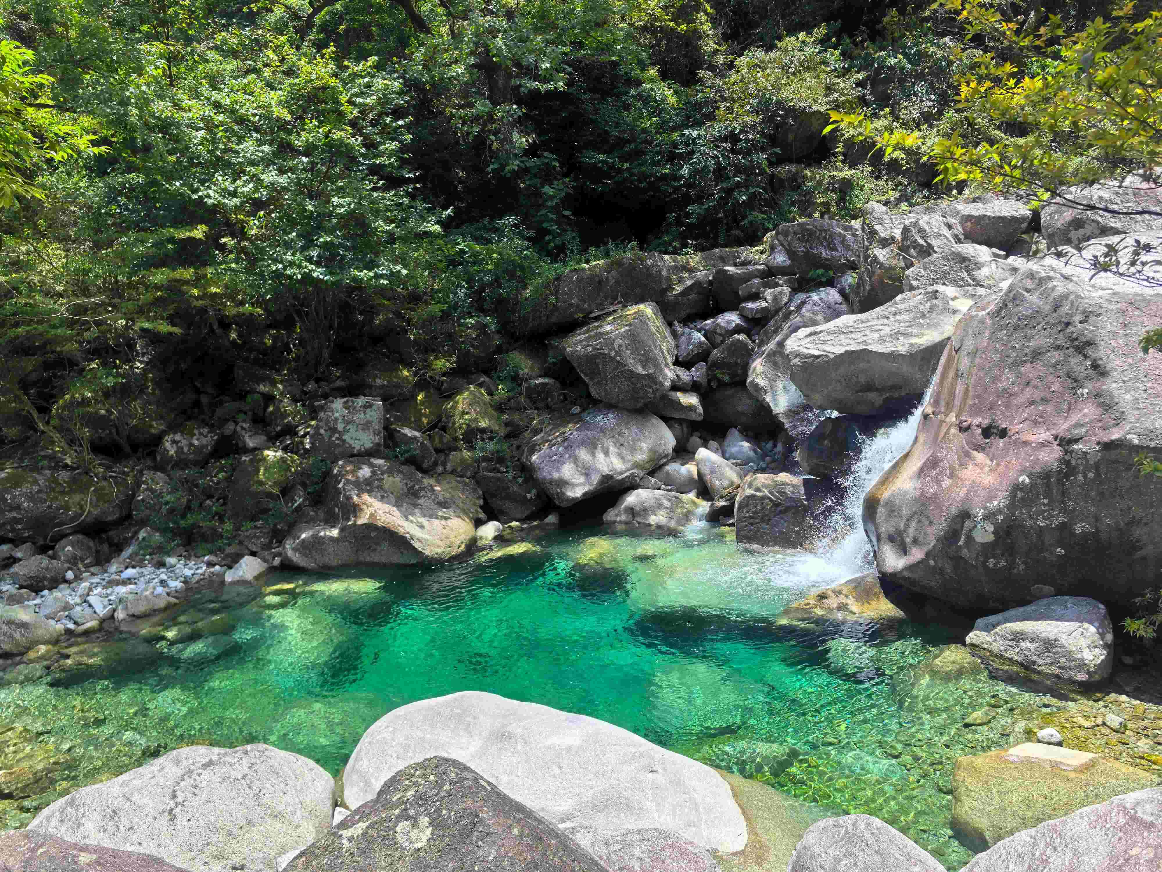 Stepping into the canyon, a refreshing chill greets visitors. The banks are lined with ancient trees, and the air is fresh, like walking into a flowing landscape painting. The water here is crystal clear, emerald green, and transparent like jelly, earning it the affectionate nickname "jelly water" from many visitors.