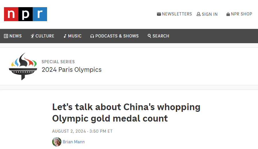 Screenshot of the reports on China's Olympic medal count from the National Public Radio(NPR) based in Washington, D.C., United States.