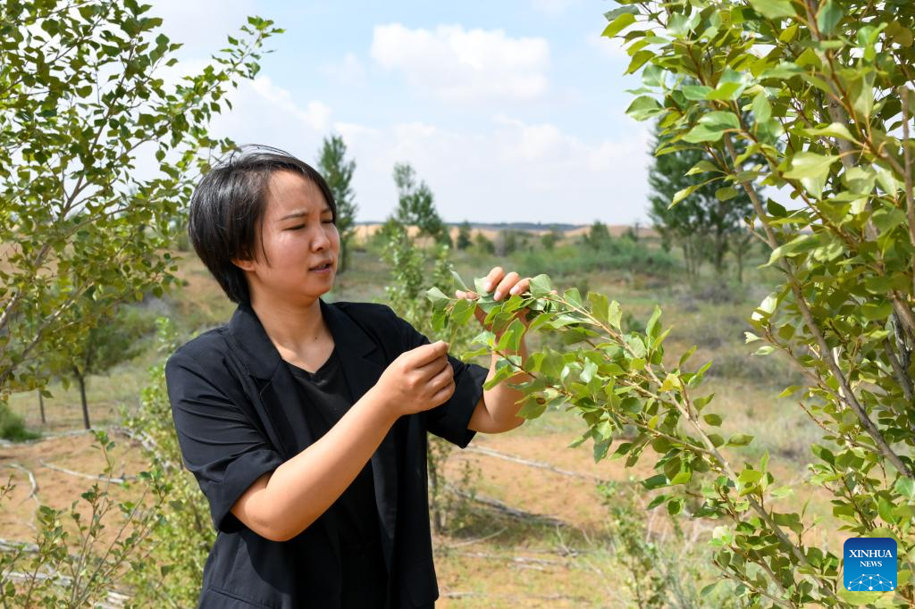 Li Fang checks the growth of trees at the Yinkentala Desert scenic spot in Dalad Banner, north China's Inner Mongolia Autonomous Region, July 31, 2024.(Xinhua/Li Zhipeng)