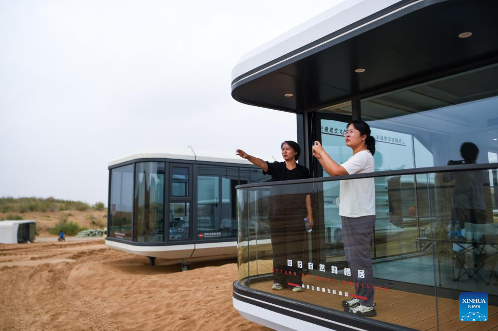 Tourists walk into a capsule camp at the Yinkentala Desert scenic spot in Dalad Banner, north China's Inner Mongolia Autonomous Region, July 30, 2024.(Xinhua/Li Zhipeng)