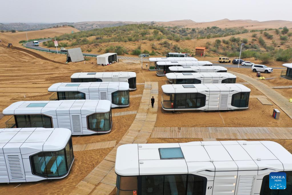 This photo taken on July 30, 2024 shows a capsule camp at the Yinkentala Desert scenic spot in Dalad Banner, north China's Inner Mongolia Autonomous Region.(Xinhua/Li Zhipeng)