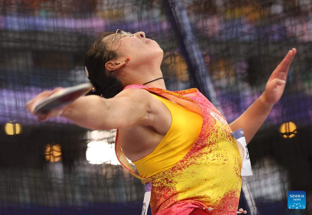 Feng Bin of China competes during the women's discus throw final of athletics at the Paris 2024 Olympic Games in Paris, France, Aug. 5, 2024. (Xinhua/Li Ming)