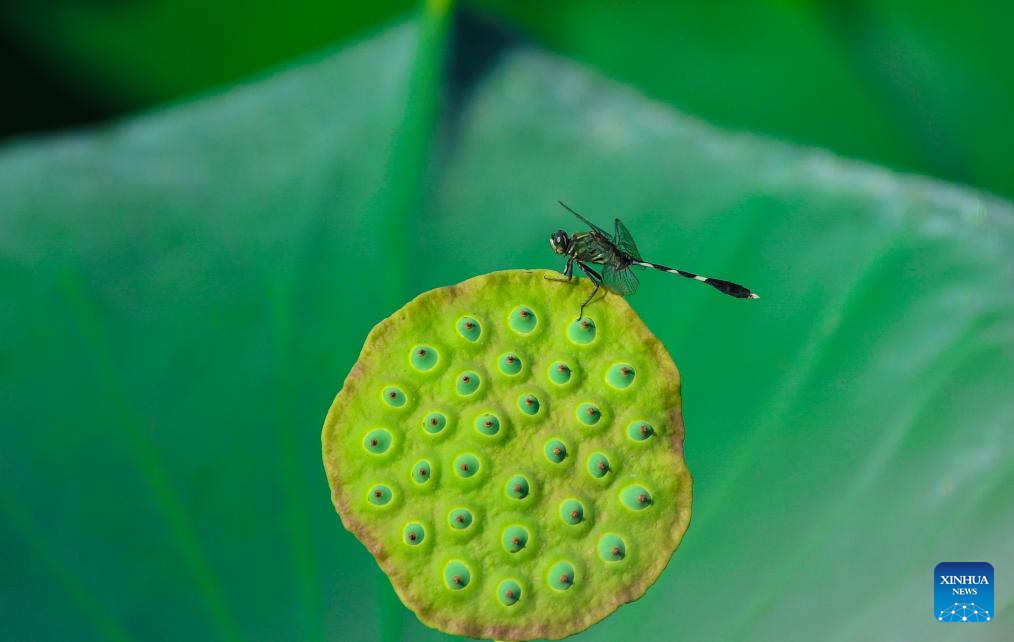 A dragonfly falls on a lotus seedpod in a pond in Changning, central China's Hunan Province, Aug. 5, 2024. (Photo by Zhou Xiuyuchun/Xinhua)