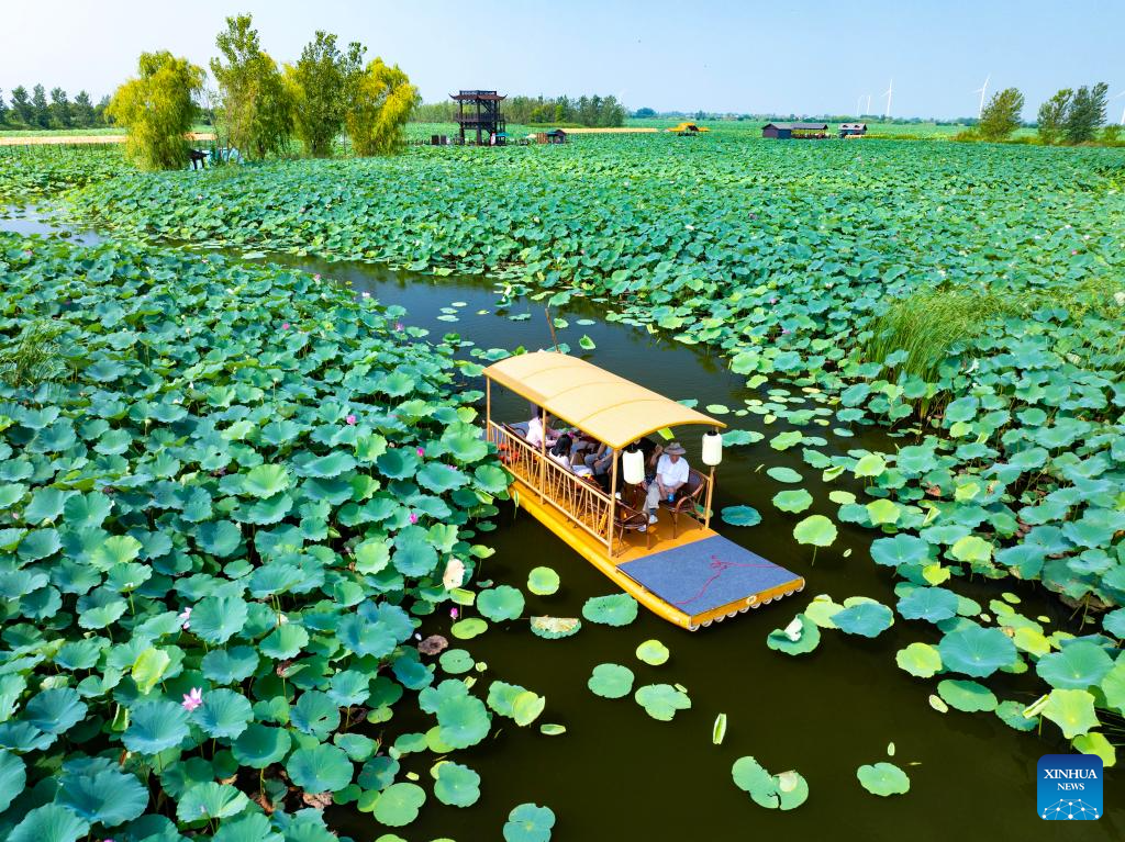 An aerial drone photo shows tourists sightseeing in a lotus pond scenic area in Xinghua, east China's Jiangsu Province, Aug. 5, 2024. (Photo by Zhou Shegen/Xinhua)
